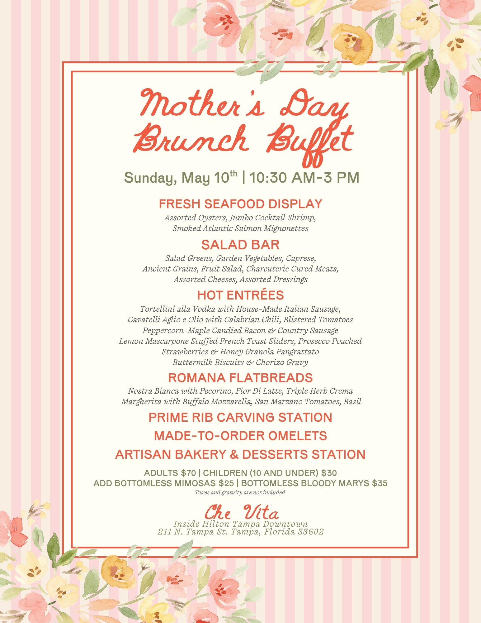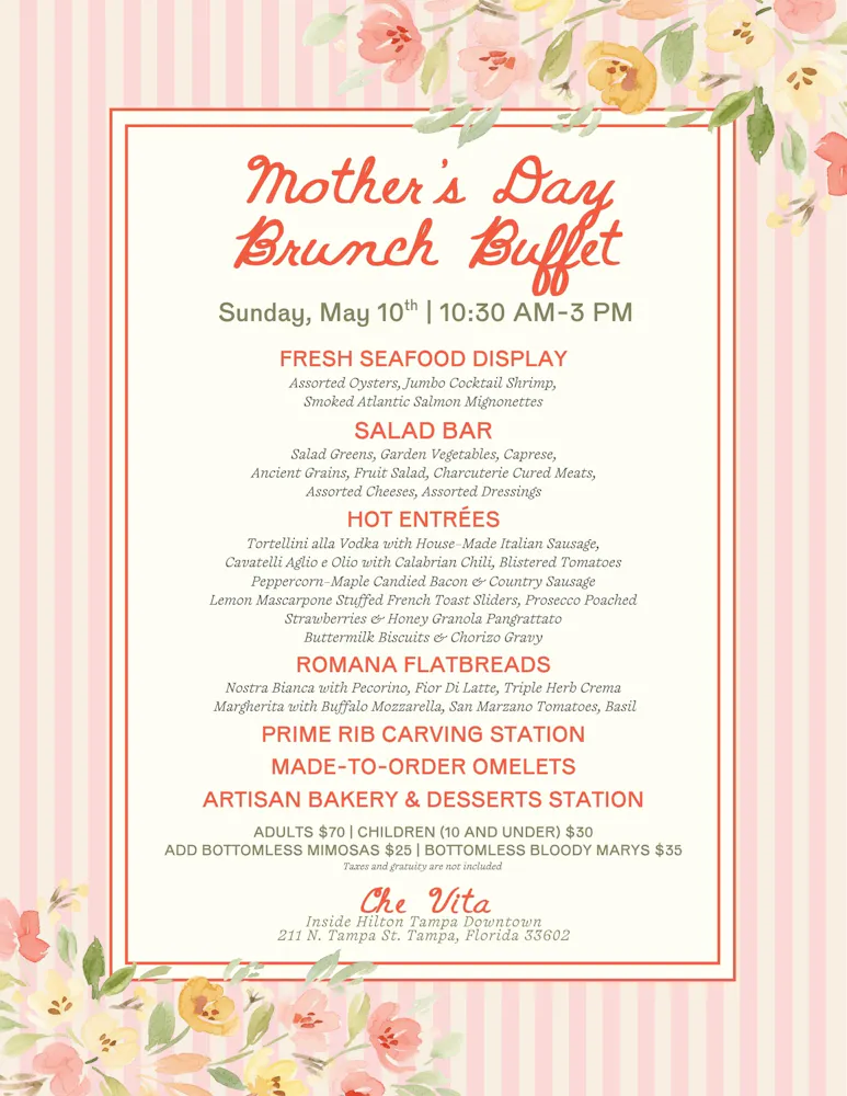 Join us from 10:30 AM – 3:00 PM and experience an elevated brunch buffet at Che Vita, located inside Hilton Tampa Downtown.